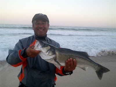 No sábado início a jornada, como sempre ás 5h45m, o céu ainda verdadeiramente estrelado e um mar fantástico…lançamento após lançamento e nem sinal deles. Começa o dia clarear e com ele o primeiro toque e peixe a seco, um miki prontamente devolvido. Mais alguns lançamentos e novo toque...sinto o peixe provavelmente acima de kg durante dois ou três segundos e desferra. Cinco minutos depois e já quase com o BlackMinnow à vista, brutal ataque aos meus pés…o labrax tem poder… drag a cantar e eu a dominá-lo com muita calma até o colocar a seco…um bonito peixe com 73cm e 4Kg.